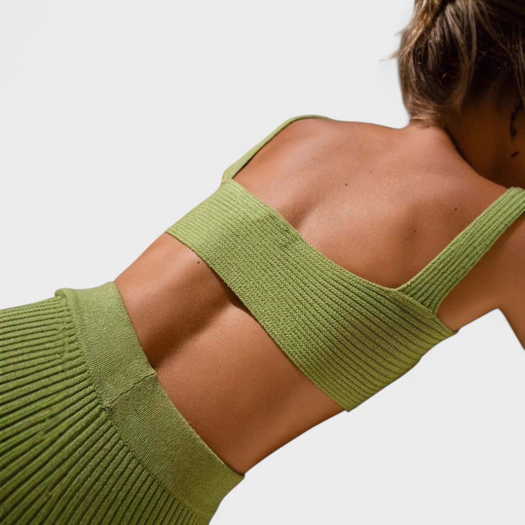 Este conjunto canelado de duas peças é a definição de elegância descontraída. Com linhas simples, tecido de malha suave e corte que abraça o corpo, é perfeito para os dias em que quer estar confortável sem abrir mão do estilo. O top de alças largas com detalhe cruzado e os calções de cintura subida criam uma silhueta moderna, ideal tanto para relaxar em casa como para um look de verão casual e sofisticado.