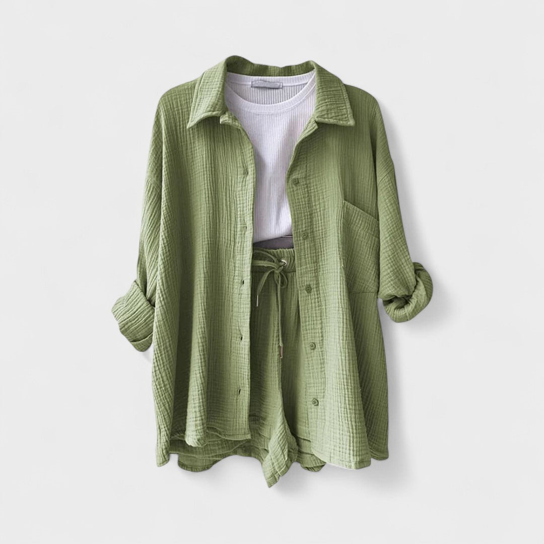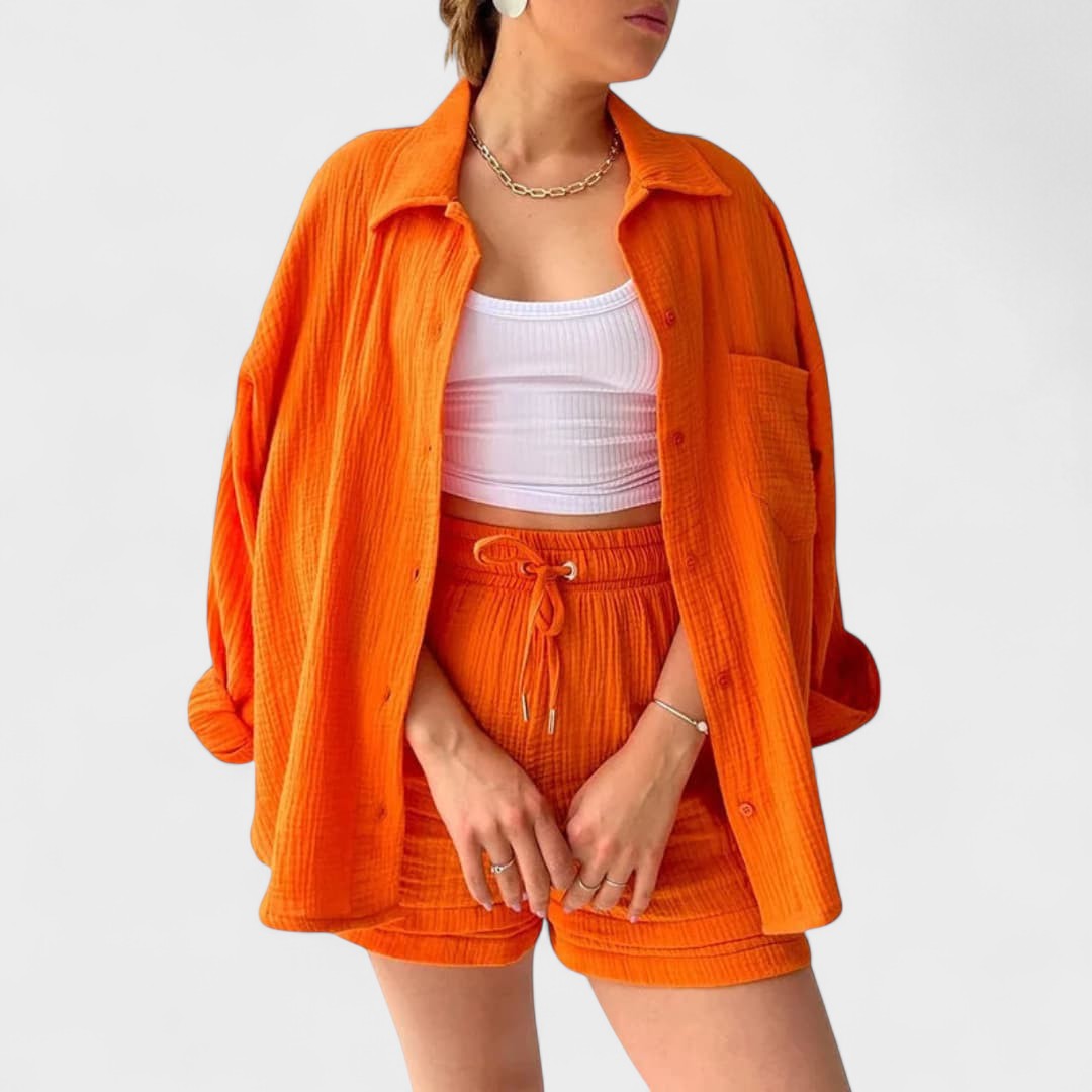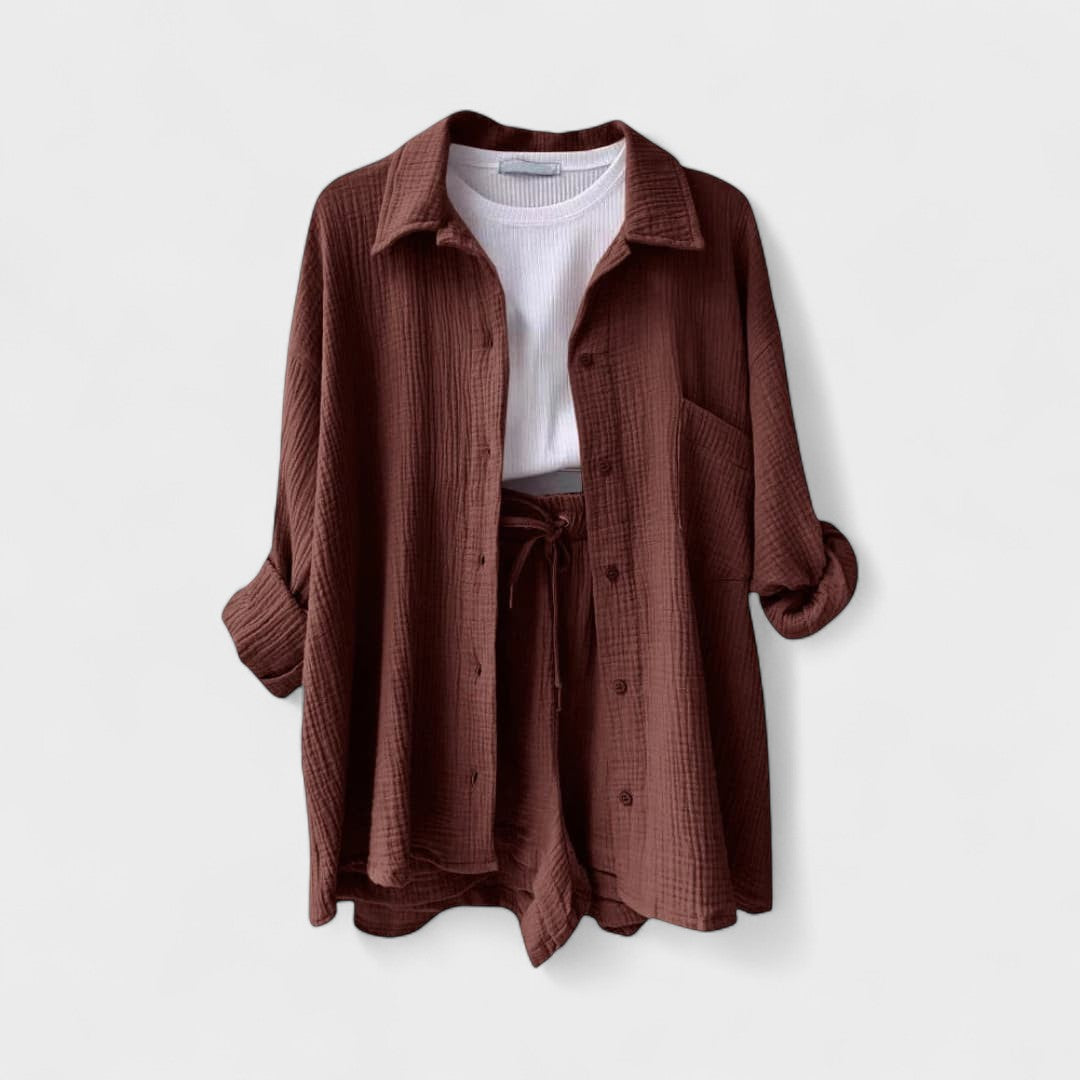 Este conjunto casual em tecido gaze de algodão é a definição perfeita de conforto moderno. Composto por camisa oversized, calções com cintura ajustável e uma t-shirt básica, o conjunto combina suavidade ao toque com uma estética minimalista e versátil. Ideal para relaxar com estilo ou para um passeio descontraído, adapta-se facilmente a várias ocasiões, mantendo sempre o visual cuidado e atual.