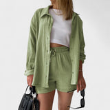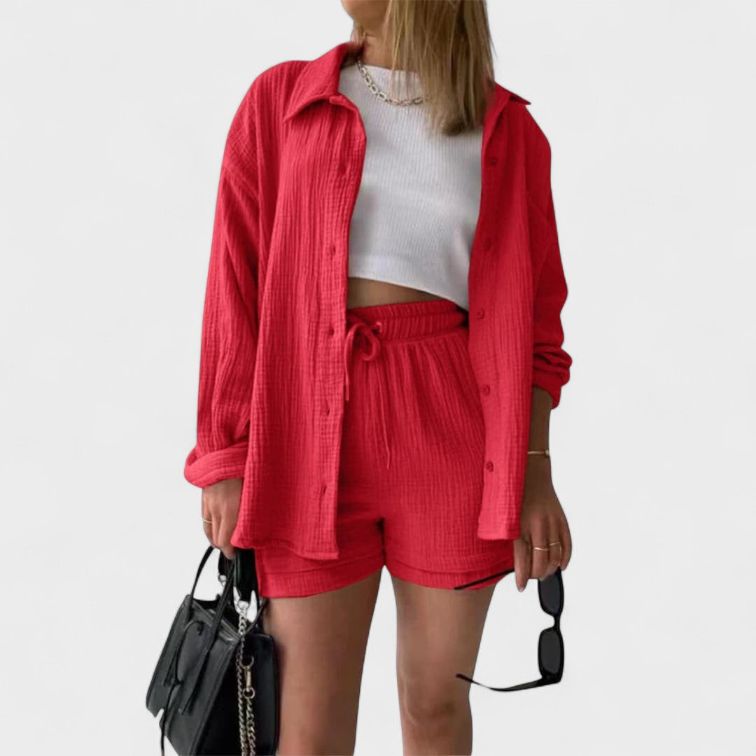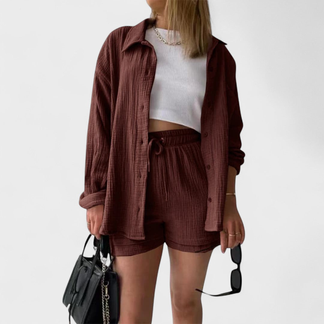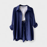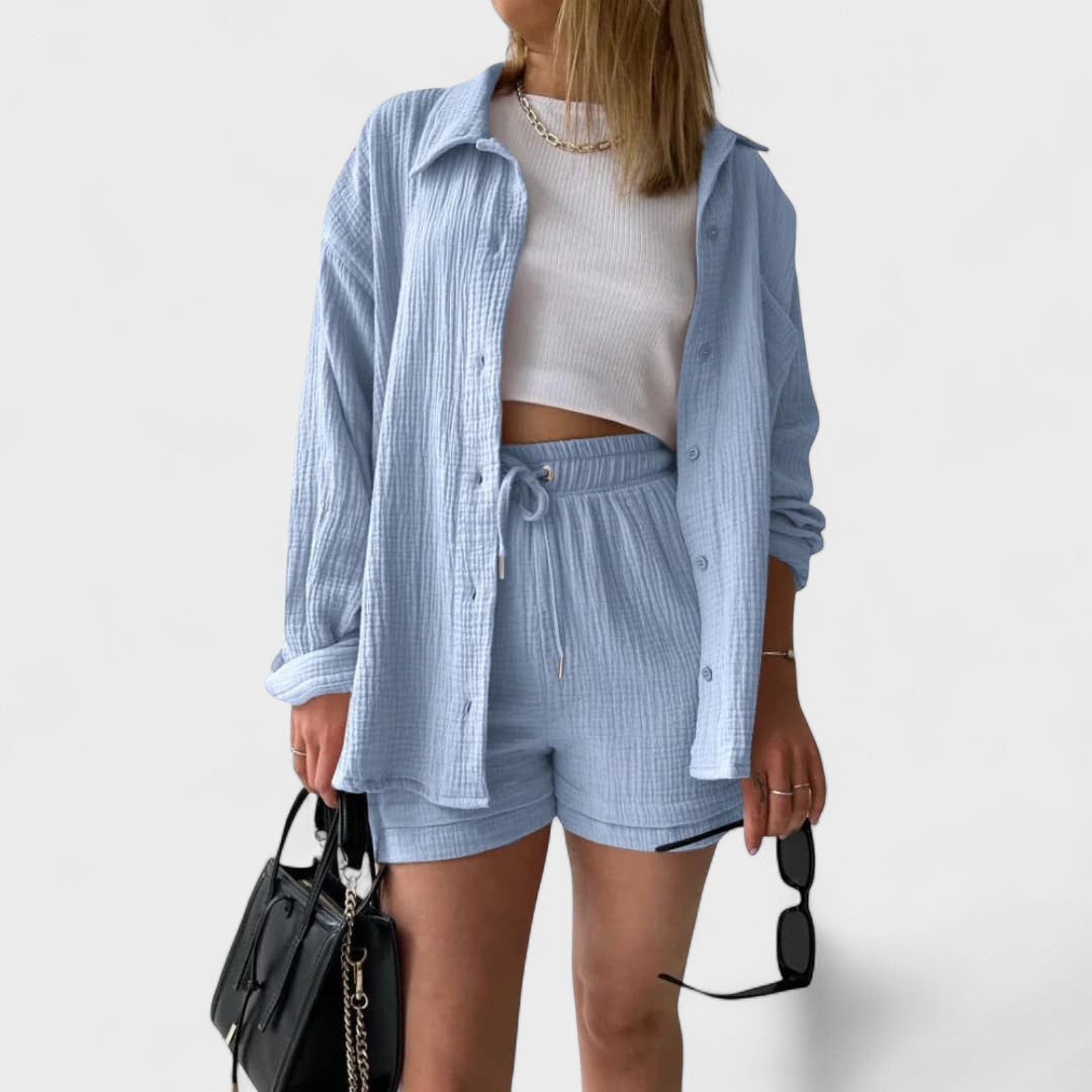 Este conjunto casual em tecido gaze de algodão é a definição perfeita de conforto moderno. Composto por camisa oversized, calções com cintura ajustável e uma t-shirt básica, o conjunto combina suavidade ao toque com uma estética minimalista e versátil. Ideal para relaxar com estilo ou para um passeio descontraído, adapta-se facilmente a várias ocasiões, mantendo sempre o visual cuidado e atual.
